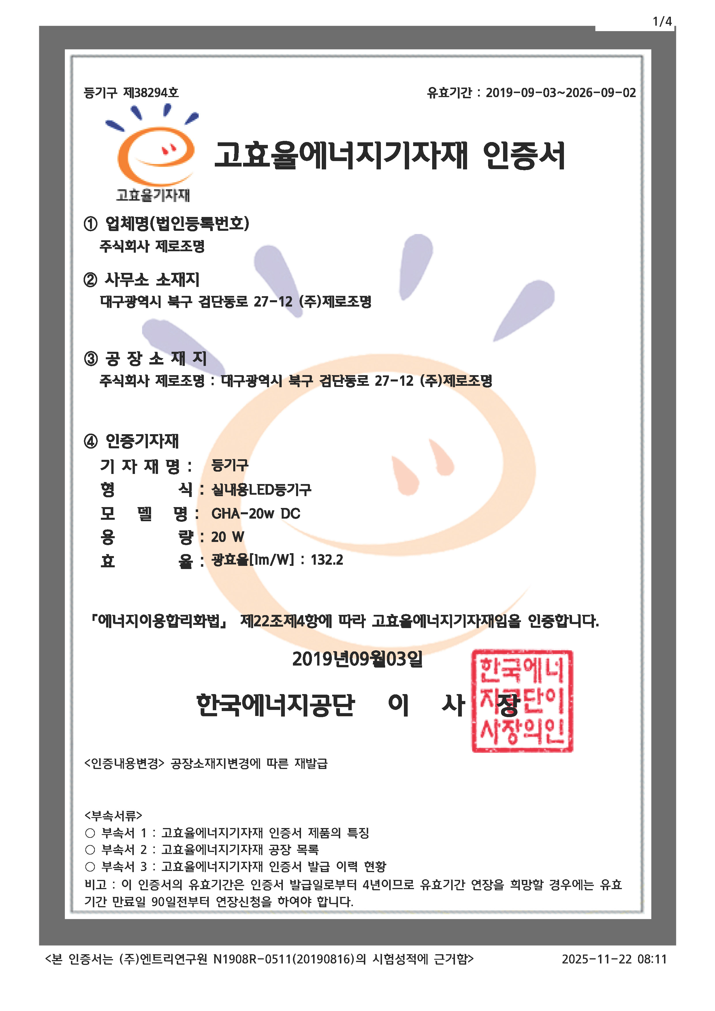 기자재명 : 등기구, 형식 : 실내용 LED등기구, 모델명 :GHA-20w DC
