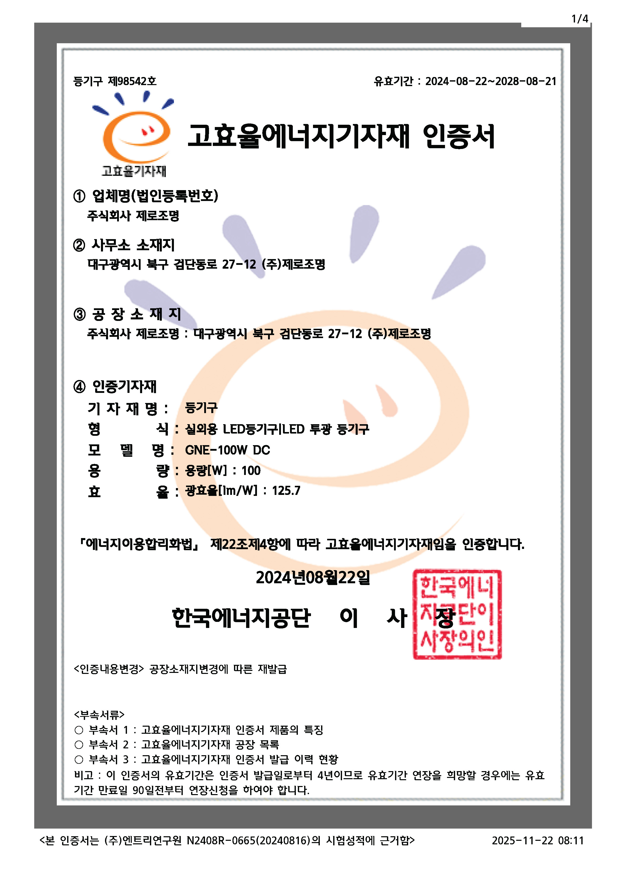 기자재명 : 등기구, 형식 : 실외용 LED등기구 | LED 투광 등기구 모델명 : GNE-100W DC