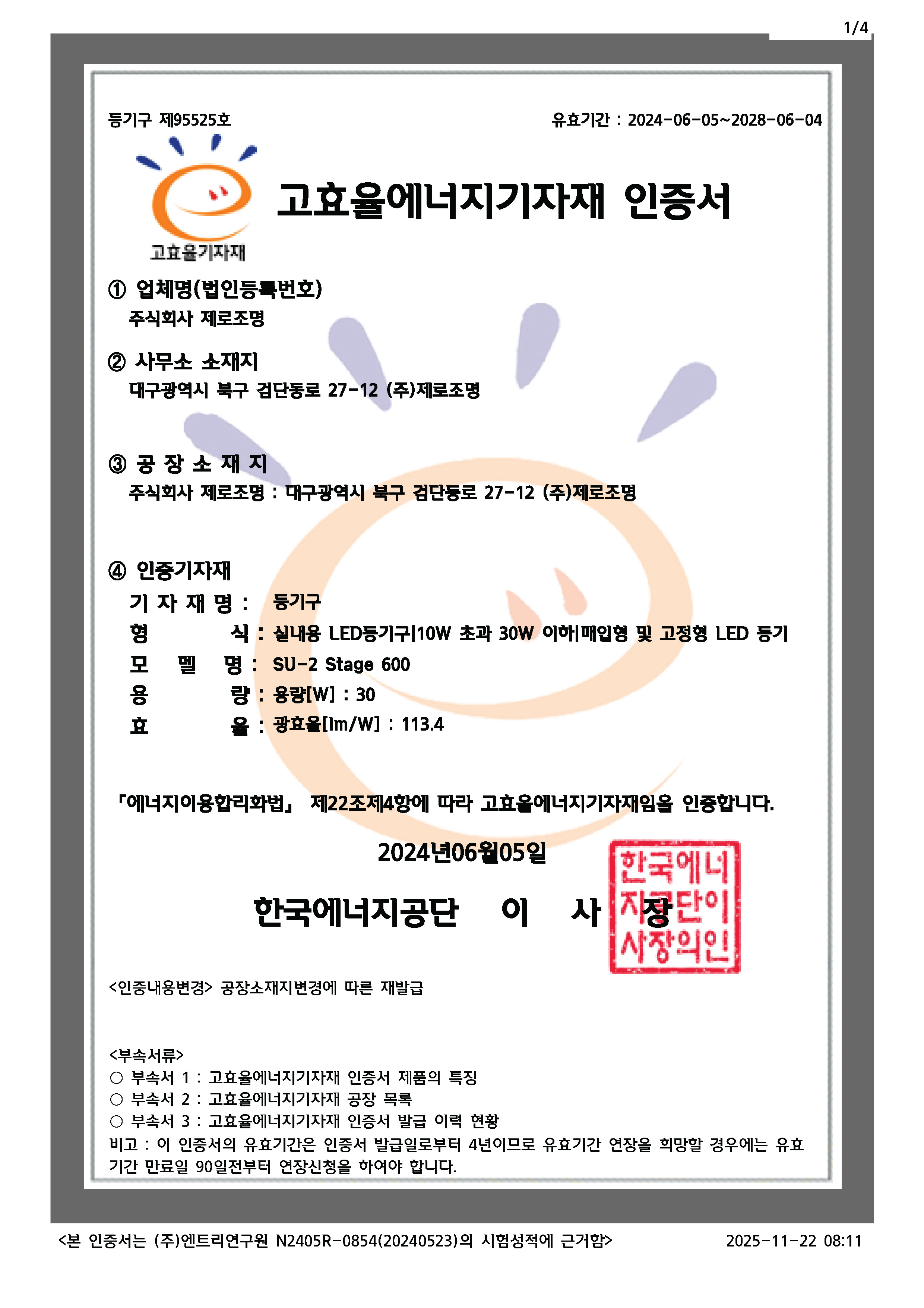 기자재명: 등기구, 형식: 실내용 LED등기구|30W 초과|매입형 및 고종형 LED 등기구, 모델명: SU-2 Stage 600